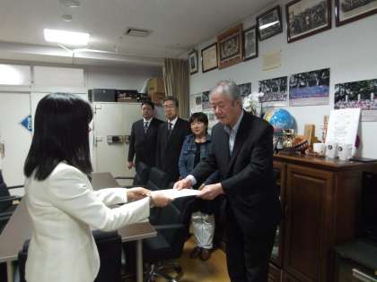 学校関係者評価委員会の天野会長より、平成27年度の報告書が手渡されました。報告書の内容を真摯に受け止め、新年度の教育活動にいかしていきまs。