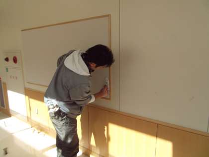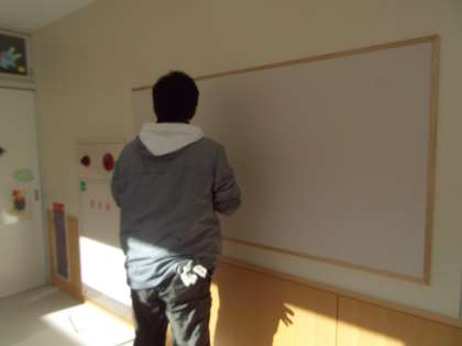 中野主事さんが、図書室前の廊下に新しく掲示板を作ってくれています。修繕だけでなく、新しい前向きな施設も素敵ですね。