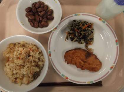 献立 こぎつねご飯 しいらのフリッター のりあえ 金時豆の甘煮 牛乳