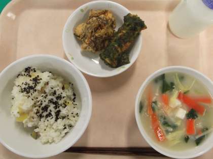 献立 さつまいもご飯 ちくわの磯部あげ もずくのフリッター 飛鳥汁 牛乳