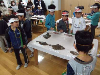 2年生が、食育の授業でたくさんの魚にふれました。アナゴ、かれい、あじ、ふぐ・・・30種類以上の魚をみて触れて感じることができました。