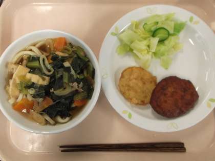 献立 わかめうどん おびてん じゃが芋の天ぷら ひとしおやさい 牛乳