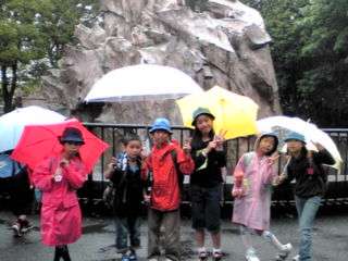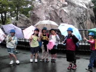 雨の中ですが元気いっぱい3、4年生が遠足に出発しました。