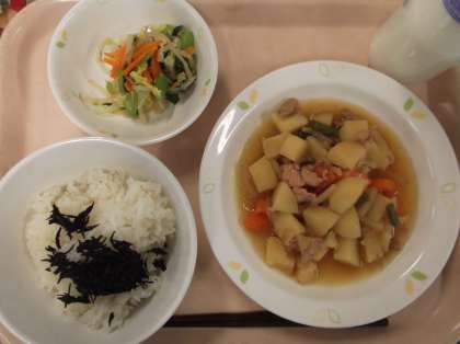 献立 ごはん ひじきふりかけ 肉じゃが みそドレサラダ 牛乳