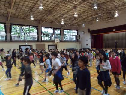今朝は、雨のため体育館でわくわく中里を行いました。