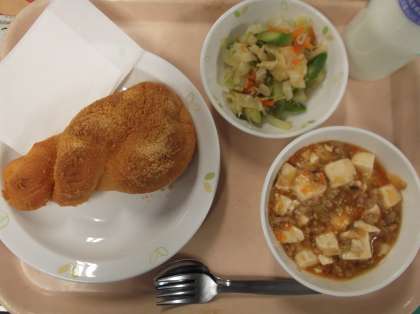 献立 きなこ揚げパン シーホー豆腐 じゃこサラダ 牛乳