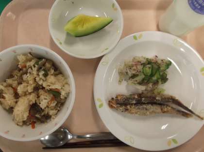 献立 鶏五目ごはん ししゃもの唐揚げ 野菜のゆかりかけ くだもの 牛乳