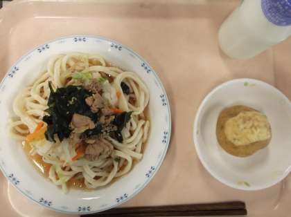 献立 冷やしわかめうどん ベークドチーズポテト 牛乳