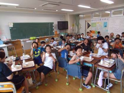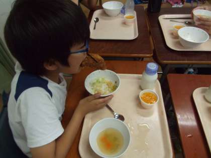 今日の給食はかつ丼!何でかつ丼か、もうお分かりですよね。明日の運動会で、かつ!!だからですね。では、何にかつのか???勝負に、白に、紅に、どれもこれも正解ですが、5、6年生に聞いたところ、「自分に克つ」と言っていました。さすがは、わが中里の高学年です。みんなもりもり食べました!!