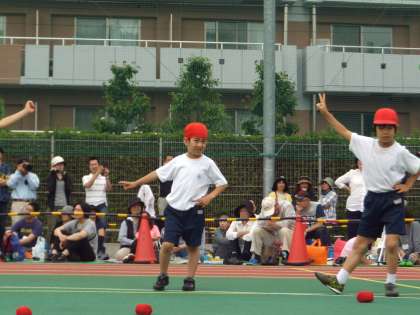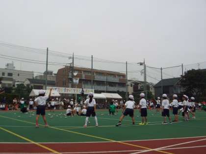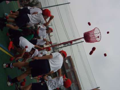 1,2年生の玉入れは、かわいいダンスを踊ってから一気に投げます!たくさん入りました。