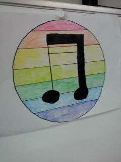 7班のシンボルマークは七色の虹と楽しい音符に7の数字を図案化したものです。これも6年生が考えてくれました。