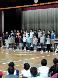 前半の弾むような曲調と後半のなめらかな曲調を表現力豊かに全校の児童が歌いあげます。学年ごとの二部合唱の響きはとても174名だけの児童数トハ思えません!
