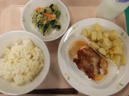 献立 きびご飯 魚のピザ風 寒天サラダ コーンポテト 牛乳