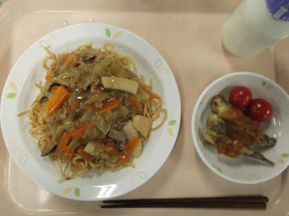 献立 あんかけ焼きそば 小いわしのピリ辛ソース ミニトマト 牛乳