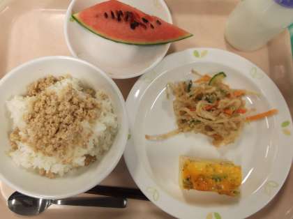 献立 ご飯 おからそぼろ ゴーヤの卵焼き 野菜のごま酢和え くだもの 牛乳