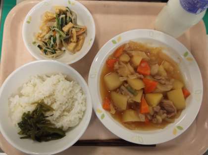 献立 ご飯 ピリ辛くきわかめ 肉じゃが 油揚げのサラダ 牛乳