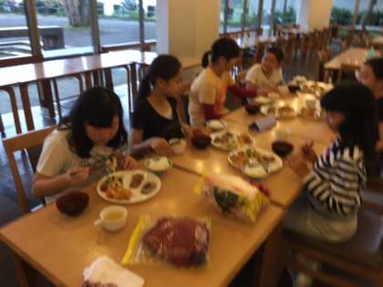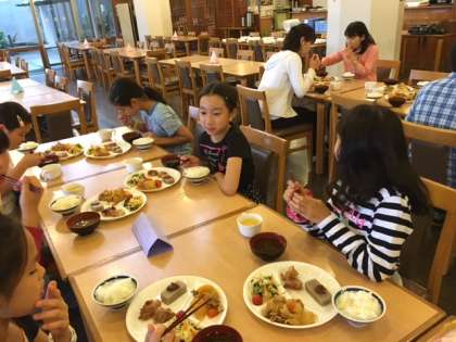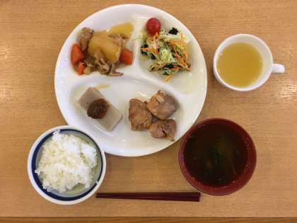 メニューは、ご飯、鶏の照り焼き、肉じゃが、わかめサラダ、豆腐青菜のみそ汁、こんにゃく、りんごジュースでした。