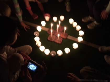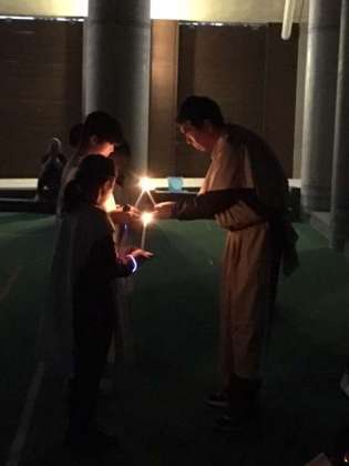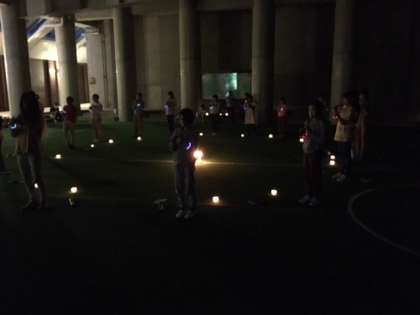 小雨がやまないので、残念ながらキャンプファイヤーができません。かわりに屋内でキャンドルサービスをおこないました。厳粛にできました。