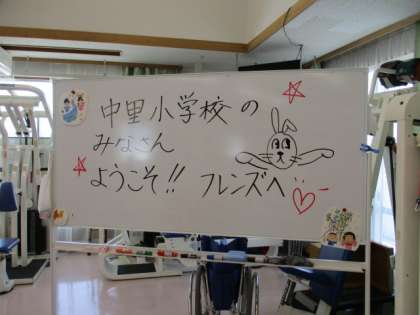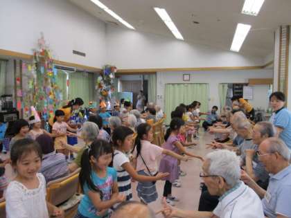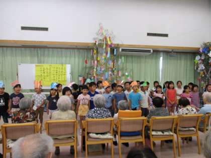 7月7日、3,4校時、1年生が高齢者施設フレンズケアセンターを訪問しました。この日のためにたくさん飾りつけをした笹をもって訪れました。初めに呼びかけ方式で学級紹介をしました。次に劇「七夕伝説」を発表しました。次にお年寄りの方と一緒に手遊びをしました。最後に似顔絵を描きその絵をプレゼントしてきました。とても喜んでくれました。