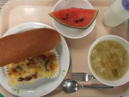 献立 黒砂糖パン ムサカ レンズ豆のスープ 果物 牛乳