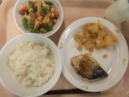 献立 ごはん さばのピリ辛焼き じゃが芋の甘辛煮 豆のサラダ 牛乳
