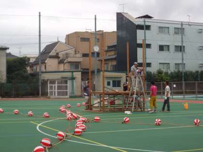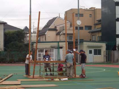 何とか雨も上がり、林工務所の方々のご協力で櫓を立てています。お祭り委員さんを中心に提灯の準備も進んでいます。明日の天気はよさそうなので楽しみですね♪準備、ありがとうございます。