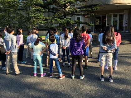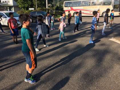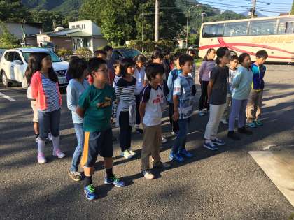 おはようございます。雲一つない好天に恵まれて日光林間学園二日目が始まりました。みんな元気です。朝会の様子です。