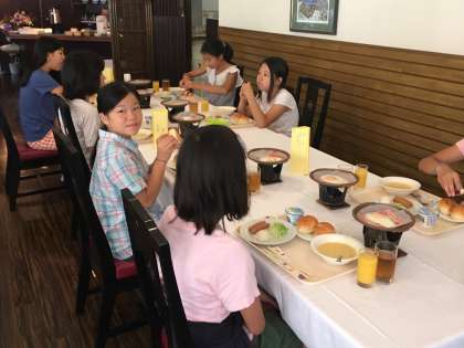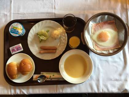 最終日の朝食です。メニューは「ロールパン、ジャム&マーガリン、コーンポタージュスープ、目玉焼き、ベーコン、ウインナー、温キャベツ、ポテトサラダ、ヨーグルト、オレンジジュース」