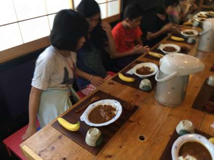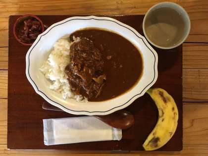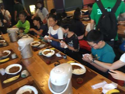 日光林間学園最後の食事、最終日昼食です。「カレーライス、福神漬け、バナナ」です。