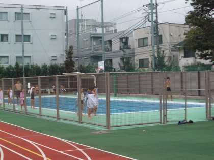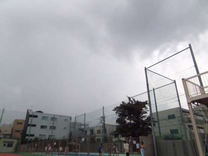 予報より早く暗雲が立ち込め、雷がゴロゴロ・・・雨がポツポツ・・・ということで、低学年の会は、始まったばかりですが終わりにしました。子どもたちは、とても入りたがっていてかわいそうですが、仕方ありません。最近、雷の事故もあるのでご了承ください。