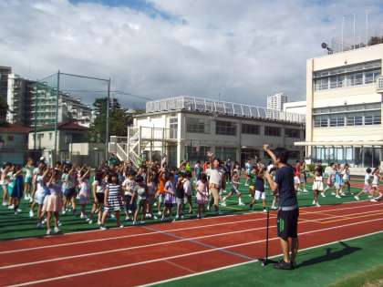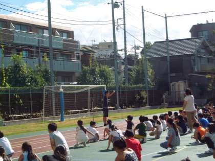 台風一過の青空の下、わくわく中里でした。「じゃんけん ポンポンどっちかひっこめて・・・」結構難しいです。脳が覚醒されます。