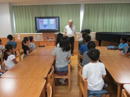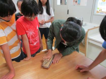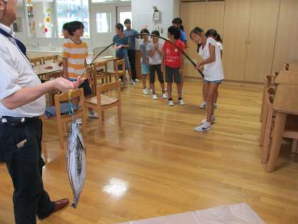 12日5,6校時、5年生は講師の先生をお呼びして日本の水産業について学習しました。その関連で食育として、鰹節や昆布のだしの勉強や鰹の一本づり体験もしました。