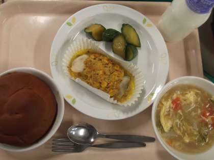 献立 ココアパン 魚のカレーマヨネーズ焼き ピリからきゅうり トマトとレタスのスープ 牛乳