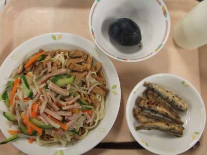 献立 冷やし中華 小イワシのごまあげ プルーン 牛乳