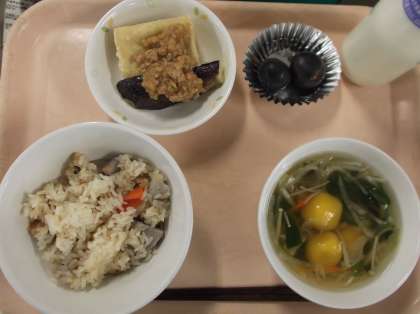 献立 里芋ごはん なすと高野豆腐のみそそぼろ 月見汁 巨峰 牛乳