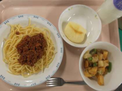 献立 ミートソーススパゲティ じゃが芋のサラダ くだもの 牛乳