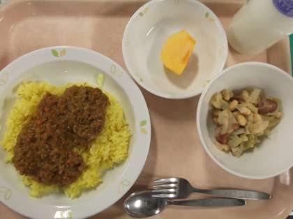 献立 エリンギのキーマカレー 豆のサラダ 柿 牛乳