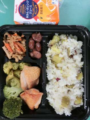 献立 さつま芋ごはん 鶏の照焼き 青のりポテト 蒸ブロッコリー 金時豆の甘煮 切干大根の煮物 オレンジジュース