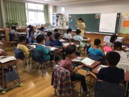 3、4年の中学年で交換授業を行いました。3年生は体育で、フリスビーを行いました。4年生は日本語で「枕草子」の学習をしました。担任の先生とは一味違う授業に取り組みました。