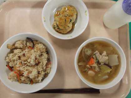 献立 子ぎつねごはん がんもどき さつま汁 牛乳