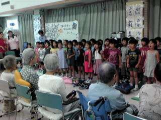 1年生の子ども達がきれいな飾りと願い事いっぱいの七夕飾りと素敵なプレゼントを届けにフレンズケアホームのおじいちゃん、おばあちゃんを訪問しました。