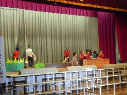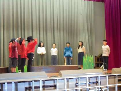 4年生「せかいでいちばんつよいくに」メッセージ性もあり、演技に気持ちがこもっていました。