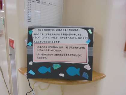 今年もさけの卵が届きました。職員室前に水槽が設置されました。温度管理が難しいのでしが、大きく育つようにと願っています。早速子どもたちがのぞきに来ています。