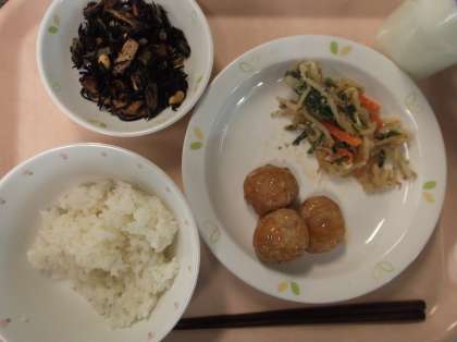 献立 ごはん 飛び魚ミートボール 野菜のごま酢かけ ひじきの煮物 牛乳