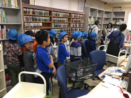 3年生は8日の午前中、近くの下馬図書館まで出かけました。図書館での約束事をまとめた絵本の読み聞かせをしてもらったり、図書館の仕組みなどについて教えていただいたりしました。普段は入れない場所にも入れてくれました。