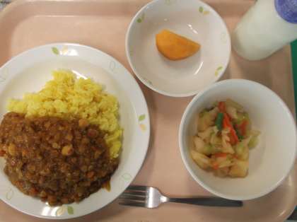 献立 ダールカレー じゃが芋のサラダ 柿 牛乳