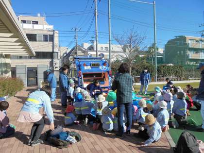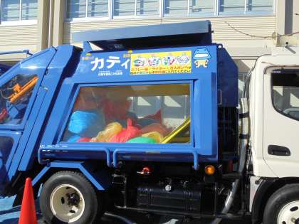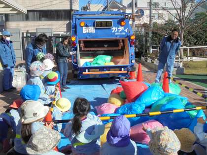 近隣の保育園の子たちが、リサイクルを中里で体験しました。スケルトンのゴミ収集車が来ていました。