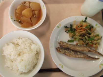献立 ごはん ししゃもの唐揚げ 野菜のポン酢和え 大根のべっこう煮 牛乳