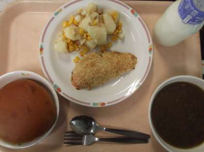 献立 黒砂糖パン 鮭のアイヨリソースパン粉焼き リヨネーズポテト オニオンスープ 牛乳