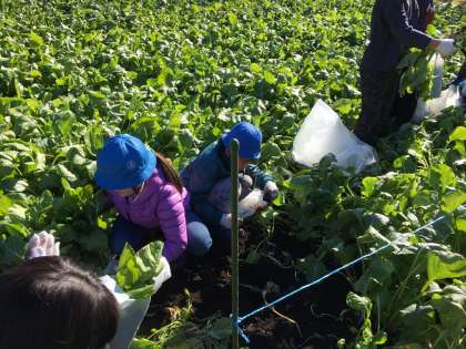この時期の小松菜は種をまいてから約2か月で収穫できるということでした。寒さから身を守るために糖分を出すので、冬の小松菜はとても甘くおいしいということでした。袋に一杯収穫しました。そのあとは、ゴミを拾い畑の土をきれいにしました。